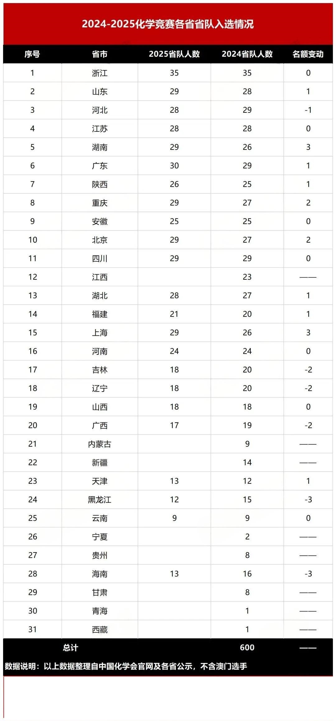 2025年有部分省份官方公示了化学竞赛省队名单,与2024年相比,省队名额也出现一定增长。