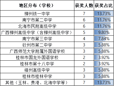 ①头部效应显著,柳州、南宁实力强劲:柳州铁一中学(7人)、南宁市第二中学(6人)和北海市民附高级中学(6人)构成第一梯队,三校获奖人数占比超过三分之一(37.25%)。传统名校广西柳州高级中学(5人)也表现稳定。