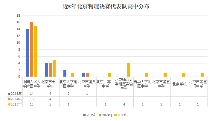 北京市物理竞赛决赛的学校分布呈现出 “寡头垄断,梯队分明,整体收缩” 的显著特征。中国人民大学附属中学(人大附中) 占据了绝对的统治地位,其近三年的入围人数(15人、16人、14人)均超过全市总数的一半,形成了 “一校独大” 的寡头格局,其优势地位其他学校难以撼动。北京市十一学校 是除人大附中外唯一能连续三年稳定输出选手的学校,构成了稳固的第二梯队。