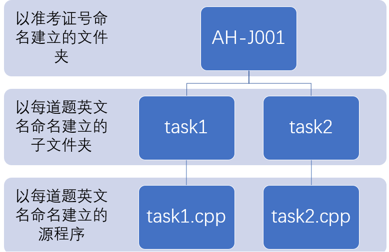 5.每位认证选手需要提交的文件要求参见https://www.noi.cn/generic/web/viewer.html?file=/upload/resources/file/2021/11/19/177576.pdf,认证选手需要建立以自己准考证号命名的文件夹,在此文件夹下建立以每道题目英文名命名的子文件夹,每道题目的源程序放到对应的子文件夹中(且此文件夹中仅包含源程序)。