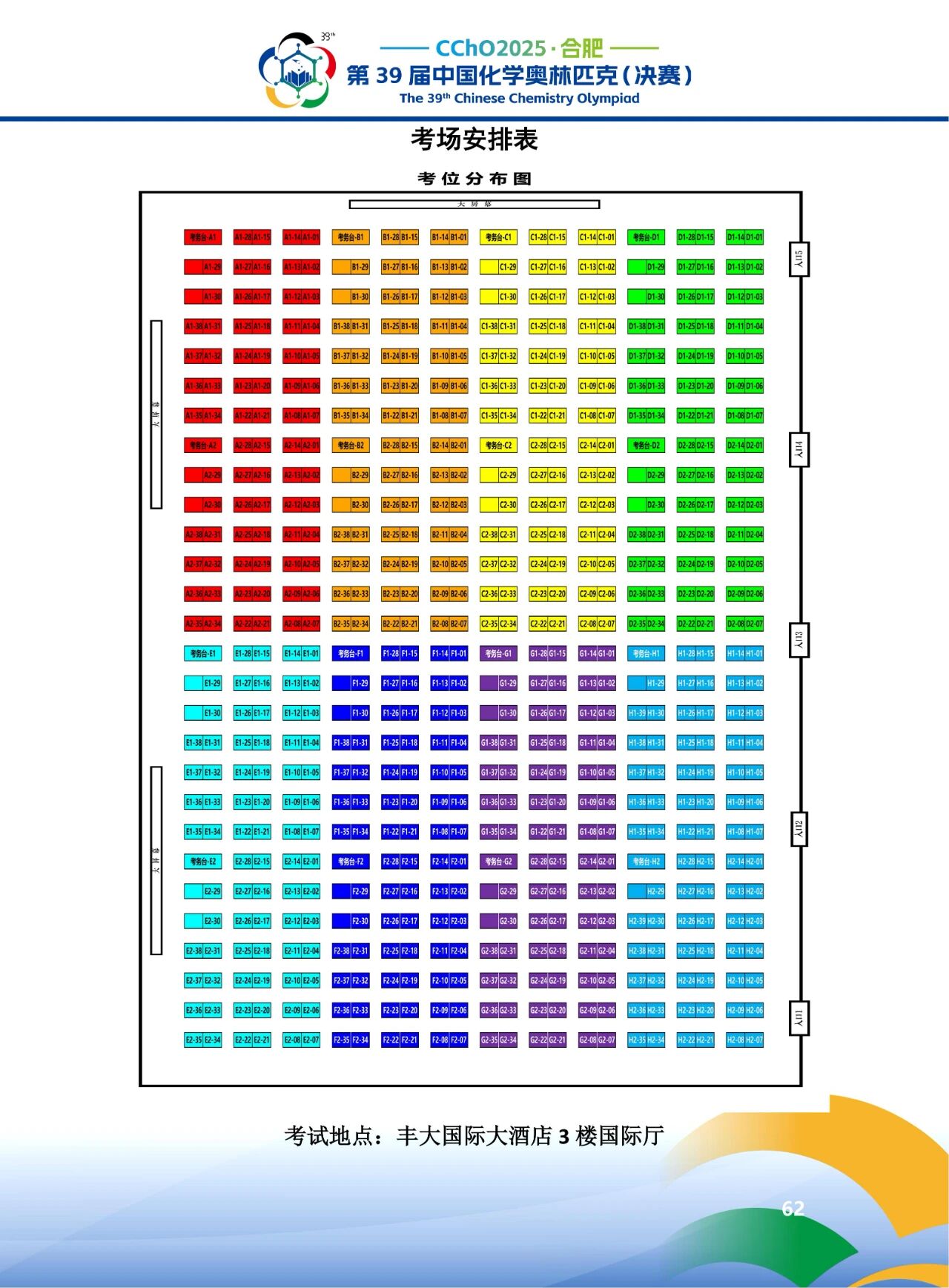2025年第39届中国化学奥林匹克(决赛)的考场安排及详细座位表现已正式确定,所有考试及相关活动将统一于安徽省合肥市的合肥丰大国际大酒店举行,活动时间为10月24日至10月29日。现将具体安排予以公布。