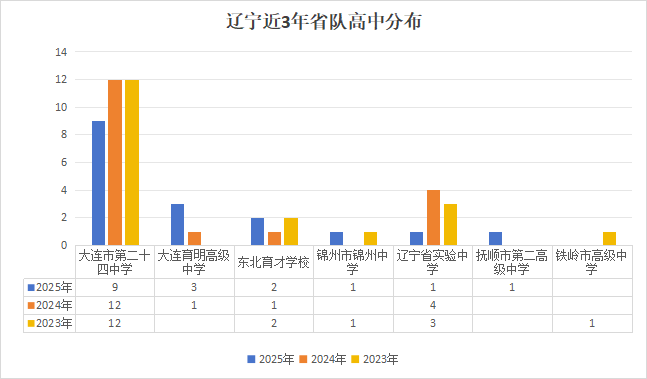 2025年辽宁物理竞赛省队共有17人入选,近三年人数呈小幅下降趋势。以下是2023-2025年决赛学校的分布格局,数据分析如下: