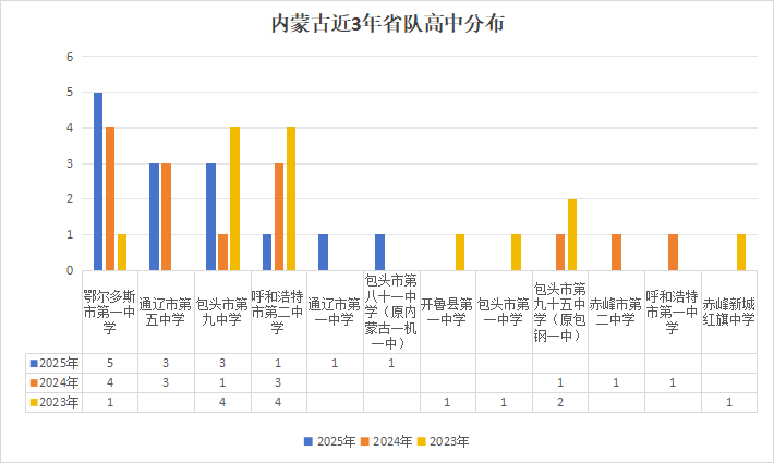 鄂尔多斯市第一中学展现出极其强劲的上升势头,成为近三年最引人瞩目的学校。其入围人数从2023年的1人,稳步增长至2024年的4人,并在2025年达到5人,跃居全区榜首,成功撼动了传统的竞争格局。与此同时,通辽市第五中学也表现稳定,连续两年均有3人入选,成为一支新兴的稳定力量。相比之下,早期的一些强校如呼和浩特市第二中学和包头市第九中学,人数则出现了显著的波动或下滑,表明自治区内的竞赛实力版图正在经历一轮深刻的重塑。