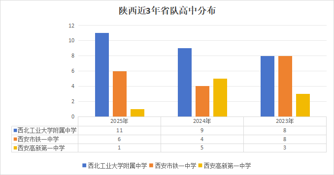2025年陕西物理竞赛省队共有18人入选,近三年人数变化幅度不大。以下是2023-2025年决赛学校的分布格局,数据分析如下: