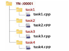 在选手答案目录下,请选手将提交的用于测评的全部文件(源代码、有关答案等)直接放在以自己的考号命名的目录下以题目英文名称命名的子目录中。以选手YN-J00001,4道题目分别为task1、task2、task3和task4为例,答案目录的储存结构为: