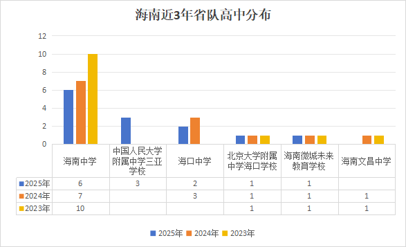 海南中学作为传统强校,虽然入围人数从2023年的10人逐年回落至2025年的6人,但依然保持着总量上的领先地位。