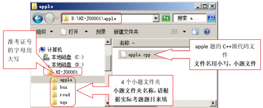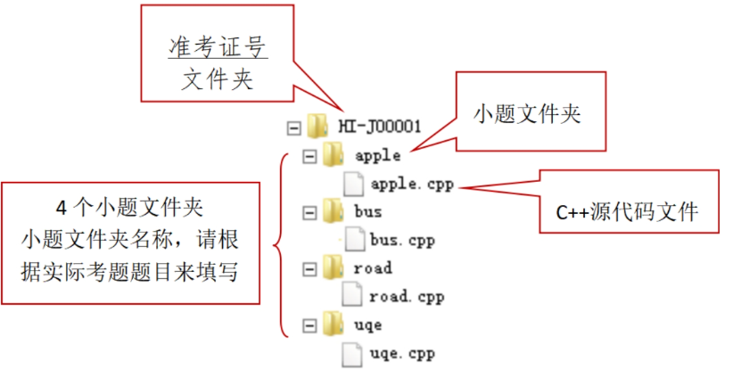 4、考生需在Windows系统的D盘建立准考证号文件夹(考号字母大写),然后在准考证号文件夹内创建小题文件夹(字母小写)。考生需将各小题的C++源代码文件保存在各小题文件夹(题目命名)内。程序源代码文件名和输入、输出文件名必须使用英文小写。源代码文件保存位置样例如图所示: