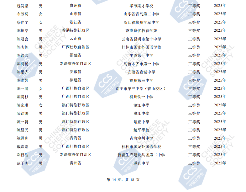 2025年第39届化学竞赛决赛铜牌获奖名单