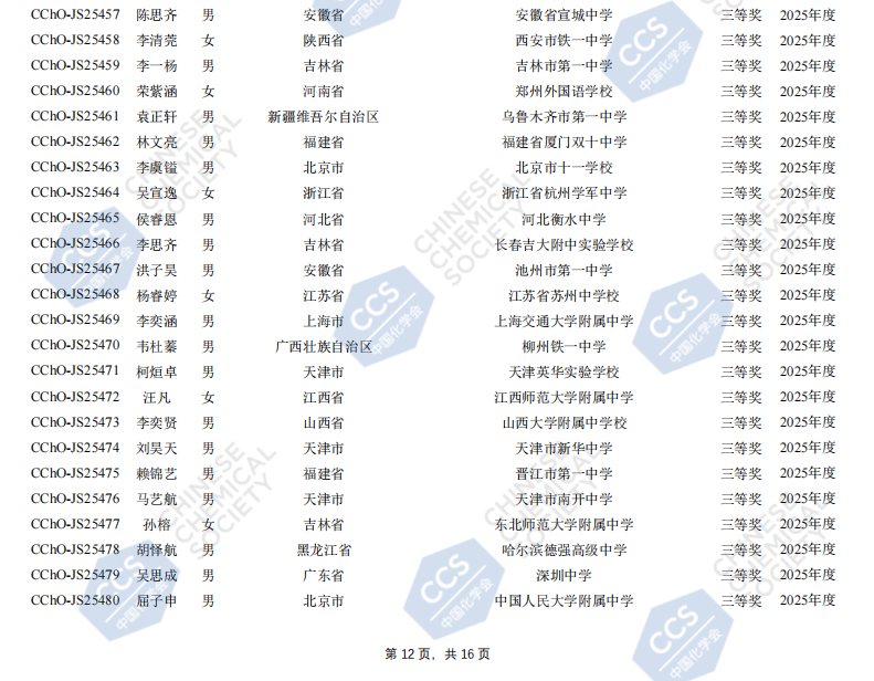 2025年化学竞赛决赛铜牌获奖名单省市榜2025-10-30