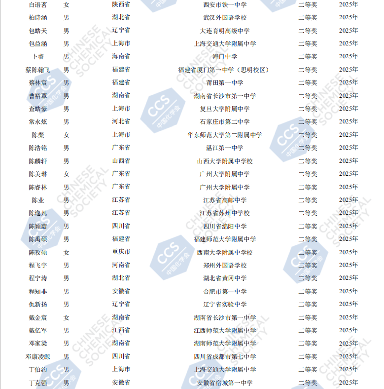 208人获奖!2025年第39届化学竞赛决赛金牌获奖名单2025-10-29