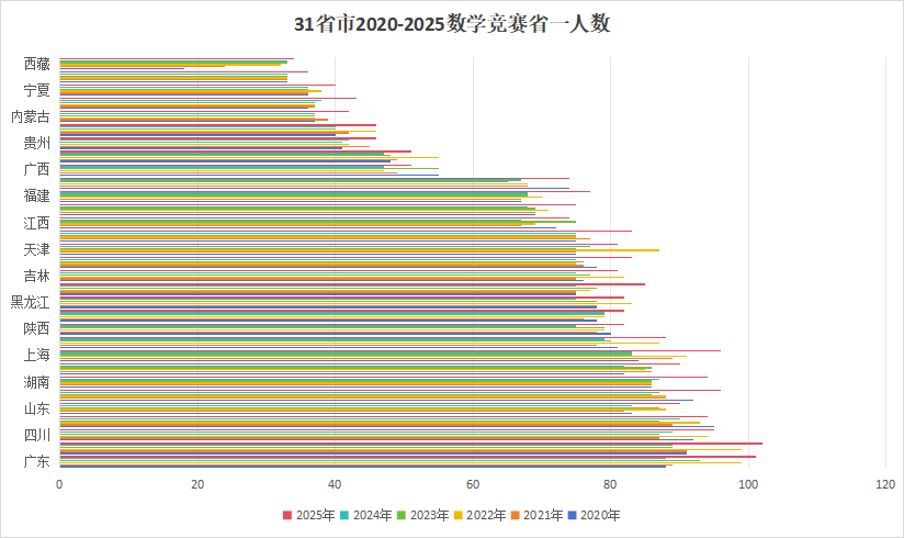 | 31省市2020-2025数学竞赛省一人数汇总 | ||||||