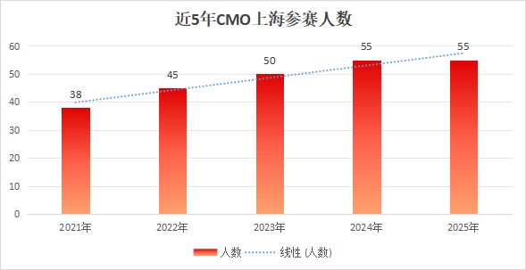 上海市数学竞赛省队规模展现出强劲且稳定的增长势头。从2021年的38人起步,省队人数连续五年保持增长,至2024年和2025年均已达到55人的高位,五年间累计增幅超过44%。这一持续上升的趋势清晰地表明,上海市在数学竞赛人才培养体系上投入卓有成效,省队整体实力和人才储备厚度得到了显著且持续的提升,竞争力不断增强。