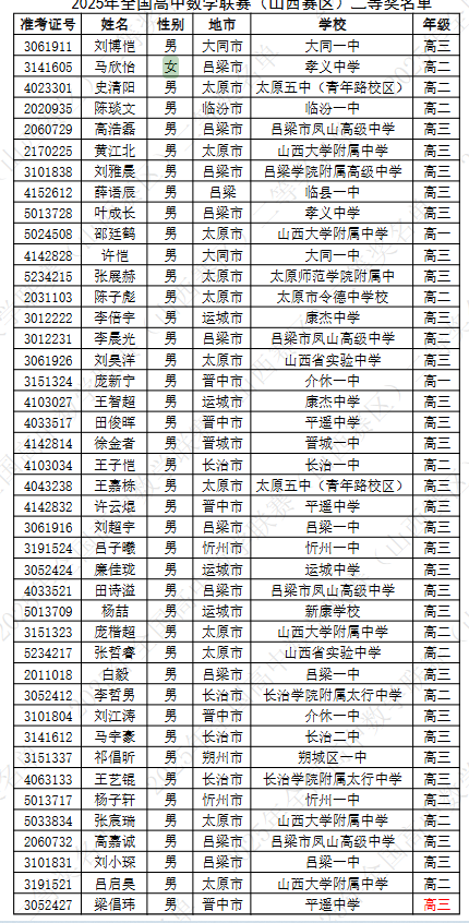 山西省2025年第41届全国高中数学联赛省二获奖名单