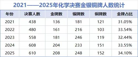 从参赛规模来看,化学竞赛的吸引力正在不断增强。2021年决赛人数为438人,到2025年已增长至610人,五年间增幅达到39.3%。这种快速增长态势既体现了中学生对化学学科的兴趣提升,也反映了各地学校对学科竞赛重视程度的提高。特别是在2023年至2024年间,决赛人数从558人跃升至608人,年增长达50人,呈现出加速发展的势头。
