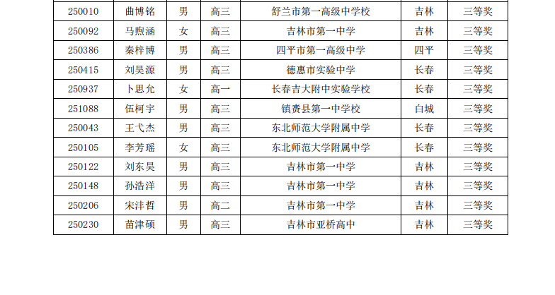 吉林省2025年第41届全国高中数学联赛省三获奖名单