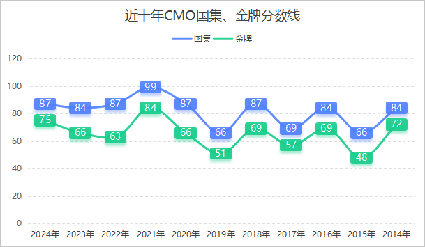 在2020年之前,国集分数线起伏较大,部分年份明显偏低:2015、2017、2019 年的分数均在70分以下;自2020年起,分数线开始稳定保持在84分以上,2021 年更是高达99分,是近十年最高的一年,需要做对接近5道题才能进入国集。