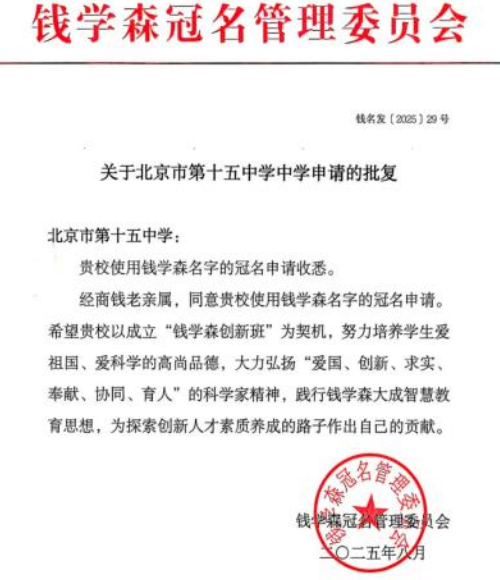 热烈祝贺北京市第十五中学获授“钱学森创新班”,为纪念人民科学家钱学森回国70周年,弘扬其卓越功勋与崇高风范,2025年11月7日,第五届钱学森班(院、校)工作论坛于重庆一中隆重举行。本届论坛由钱学森教育工作委员会、重庆市沙坪坝区教育委员会及钱学森科学教育研究会联合主办。论坛现场宣读了关于在北京市第十五中学设立“钱学森创新班”的批复。钱学森教育工作委员会主任委员、钱学森先生之子钱永刚教授亲临现场,并向我校授牌。