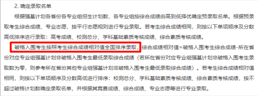 🌈特别提醒:2025年清华北大两校采用“综合成绩相对值”排序方式,作为破格生强基录取标准(综合成绩相对值=破格入围考生综合成绩-所在省份对应专业组强基计划非破格入围考生最低录取综合成绩),与其他高校破格生需达到第一类考生最低录取分数线的标准不同,清北破格生即使综合成绩比非破格生低,依然有被录取的可能。
