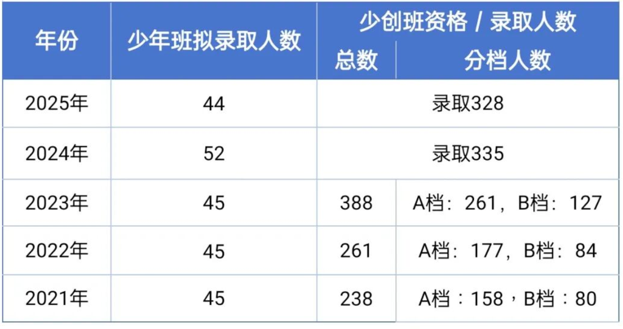 2025年少年班学院共录取372人,少年班录取44人,少创班录取328人。通过近几年录取数据可以看出,少年班录取人数较为稳定,基本维持在45~50人左右,少创班人数逐年增加,在2025年有所回落。
