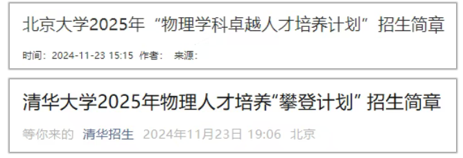 清华物理攀登计划、北大物理卓越计划这两大拔尖创新人才选拔项目都是面向有物理学科特长的同学进行招生,被录取的学生将进入本校的物理类专业学习。以下则是清北物理少年班的报考要点介绍,内容来源于2025招生简章仅供参考,一切以最新政策为准: