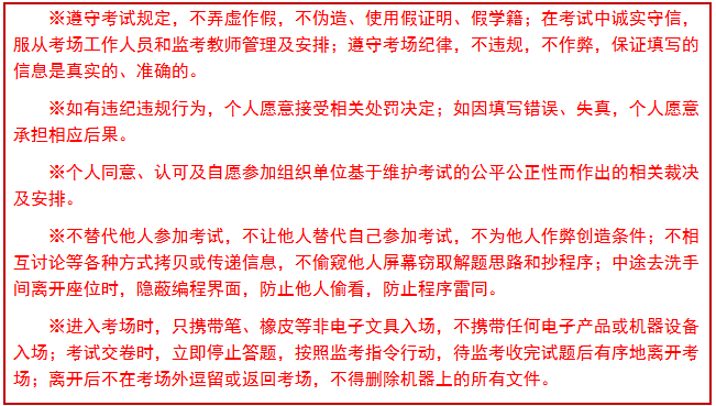 为了提高效率,减少手续,本次考试不用额外携带承诺书。选手进入考场,即表示认同及做出下面的郑重承诺: