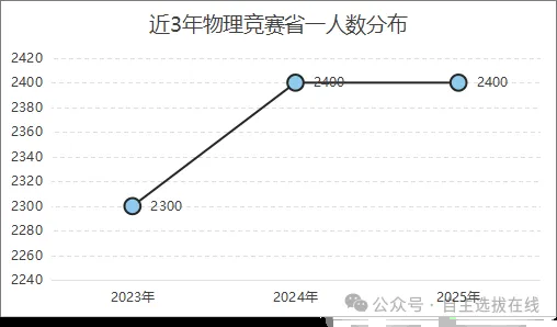 2025年物理竞赛省一名额共有2400人,从近3年数据来看,省一名额已经从涨幅明显到逐渐平稳,2024年上涨100人,今年名额与24年相同。