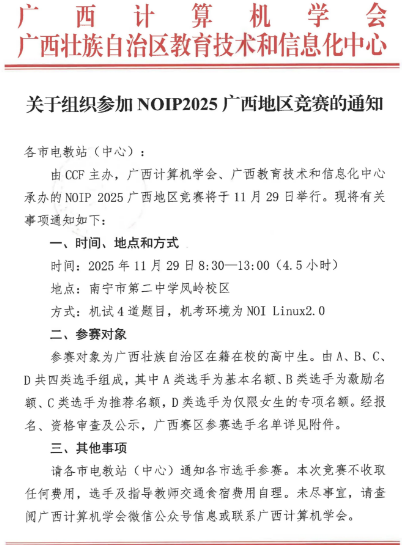 根据中国计算机学会(CCF)的统一安排,全国青少年信息学奥林匹克联赛(NOIP 2025)将于2025年11月29日在各省赛区同步举行。现通知NOIP 2025广西赛区具体考试信息如下,跟随自主选拔在线团队一起来看具体通知内容!