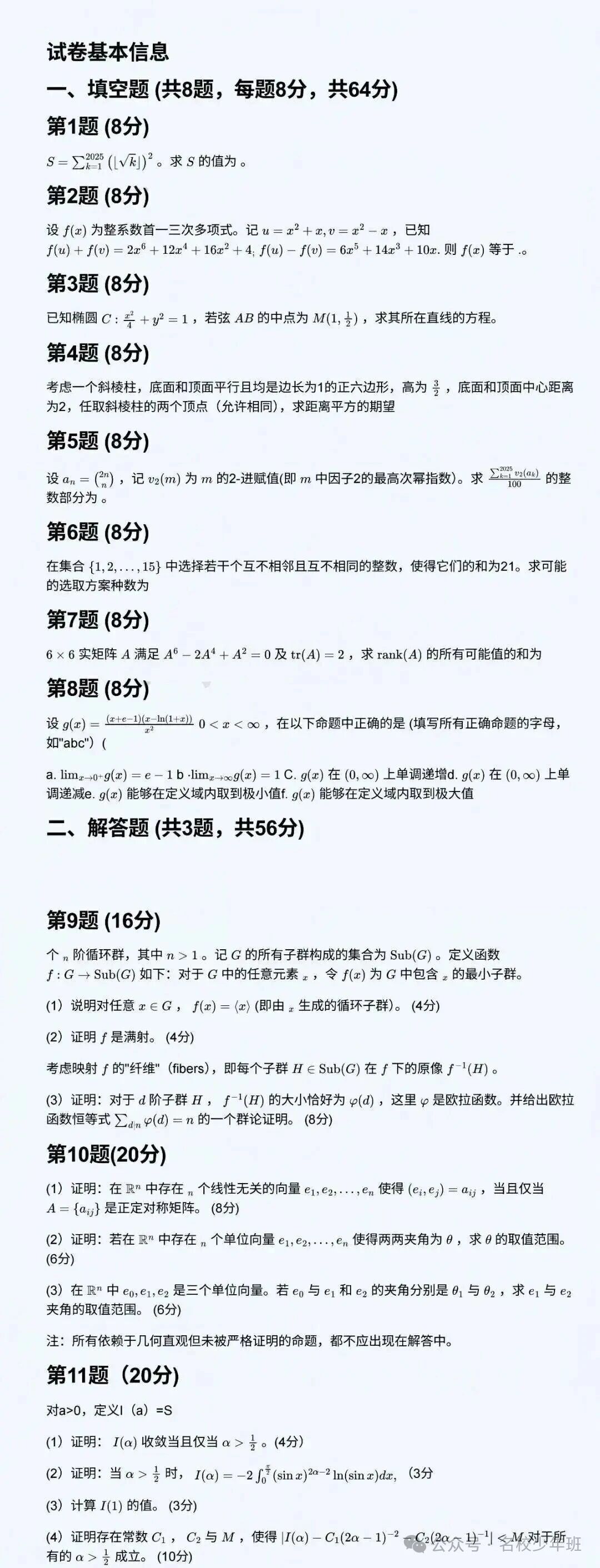 11月22日,丘少班进行了全国大统考,考试方式是在线,使用的工具是清华丘成桐数学科学中心开发的测评系统。这个系统,全国授权的丘班都可以使用。自主选拔在线团队整理2025年全国丘班大统考试题及答案相关内容,以便考生参考。