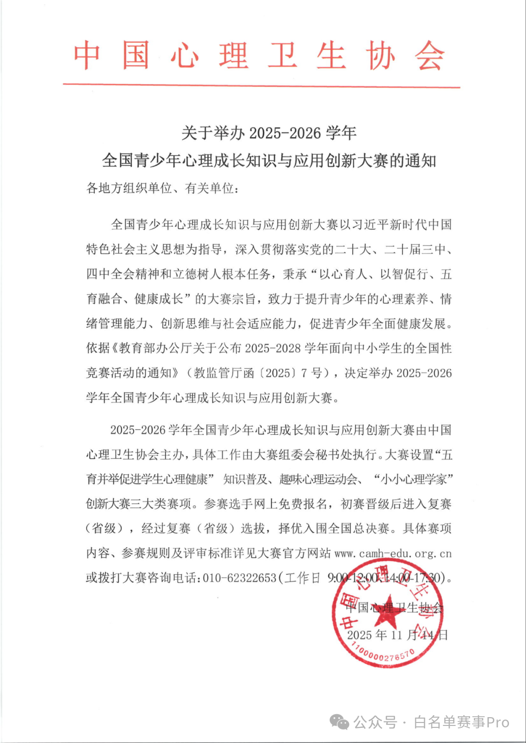 2025-2026学年全国青少年心理成长知识与应用创新大赛举办通知近日发布!该赛事首次入选教育部 2025—2028 学年面向中小学生的全国性竞赛活动名单(即“白名单”),也是白名单赛事中唯一一项与“心理健康”有关的赛事。自主选拔在线团队整理2025-2026学年全国青少年心理成长知识与应用创新大赛举办通知相关内容,以便考生参考!