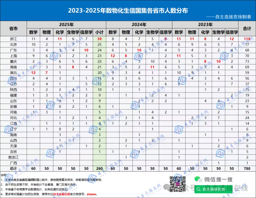 与此同时,北京(25人)、广东(24人)表现格外亮眼:北京靠数学10人、生物学7人的优势冲上第二,广东则凭信息学10人的“爆点”稳居第三;上海(23人)、重庆(22人)紧随其后,前五强的竞争比往年更胶着。