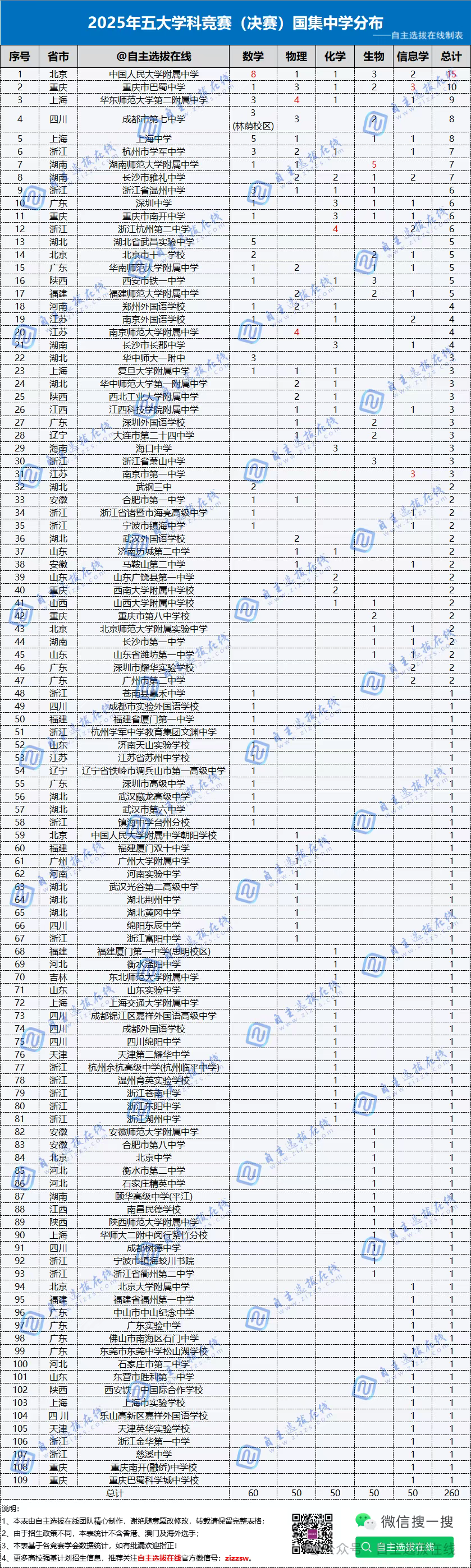 但部分强校“偏科”现象突出,如湖南师范大学附属中学13名国集中有5人来自生物竞赛,化学、信息学无国集;上海市上海中学8名国集中仅覆盖数学(5人)、物理(1人)等少数科目。这也说明强校的优势集中在特定学科,学校实力需结合科目具体评估。