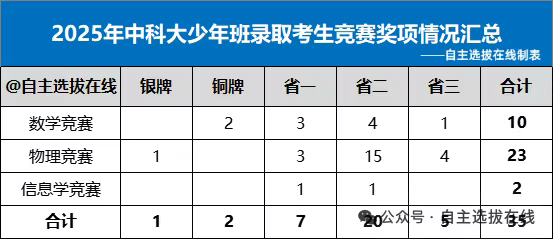 根据统计数据来看,竞赛科目主要集中在数学和物理中,少数信息学也有机会;竞赛奖项主要集中在省二,省一与省三也有一部分。