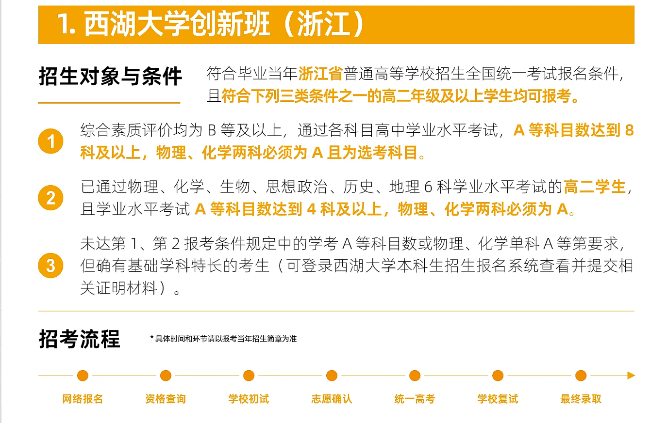 3.未达第1、第2报考条件规定中的学考A等科目数或物理、化学单科A等第要求,但确有基础学科特长的考生(可登录西湖大学本科生招生报名系统查看并提交相关证明材料)。