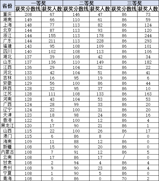 各省各奖次分数线如下: