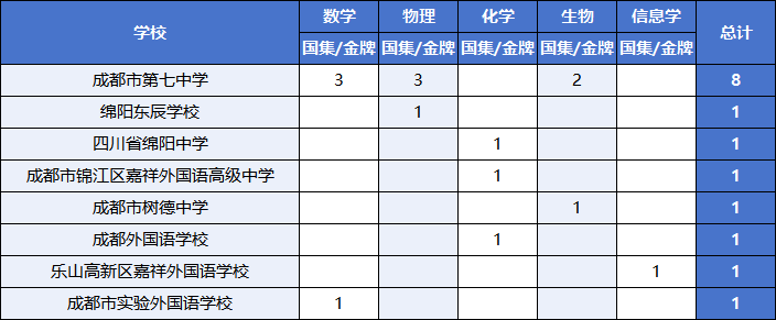 成都市第七中学以总计8个国集遥遥领先,占据所有国集考生的一半以上。七中优势不仅体现在总量,更体现在学科的全面性上:在数学、物理、生物三个学科均获顶级奖项,尤其在数学和物理上各获3个,展现了深厚的理科竞赛底蕴。