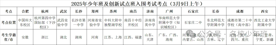 2025年中科大少年班、创新班入围考在上午8:30-12:10开考,入围考试只考数学和物理两个科目,主要考查知识结构、基础概念、逻辑思维。在陕西、浙江、四川、江西、吉林、河北、安徽、湖北、湖南、江苏、山东、广东、吉林等省市均设有考点。