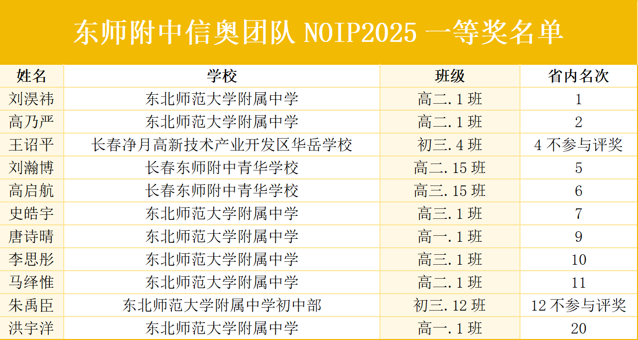 NOIP2025 联赛中,吉林省共有一等奖16名,东师附中信奥团队有9名同学获得一等奖,其中高二1班刘淏祎同学位列吉林省第一名。