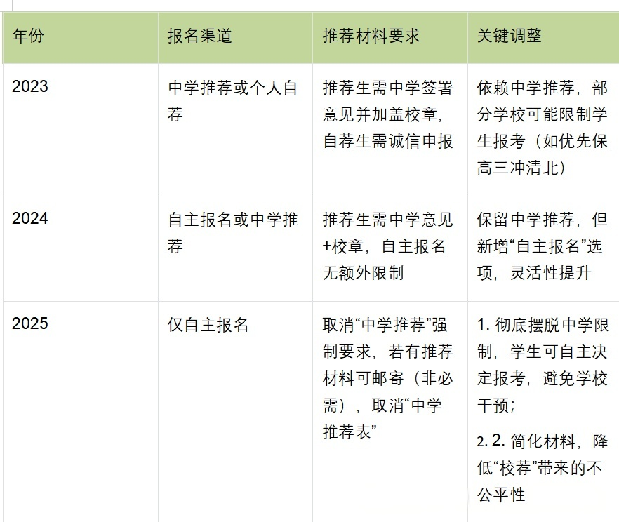 影响:2025年改革后,优秀学生无需依赖学校推荐,尤其适合学校资源有限或学校不支持提前报考的考生,报名自主性大幅提升。