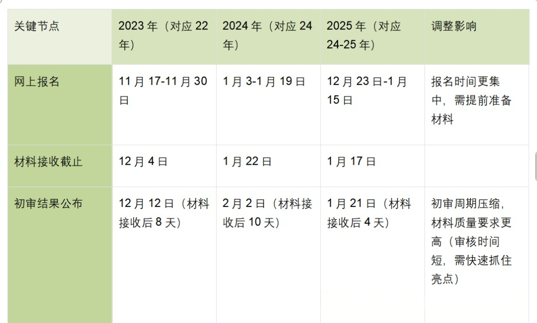 影响:2025年初审仅4天,考生需提前完善材料(如成绩单、获奖证明、个人陈述),避免因准备仓促导致初审不通过。