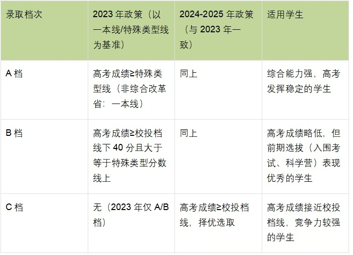 中科大少创班的核心优惠集中在高考降分录取和特殊考生政策,三年来整体稳定,仅24年新增C档,25年无调整:
