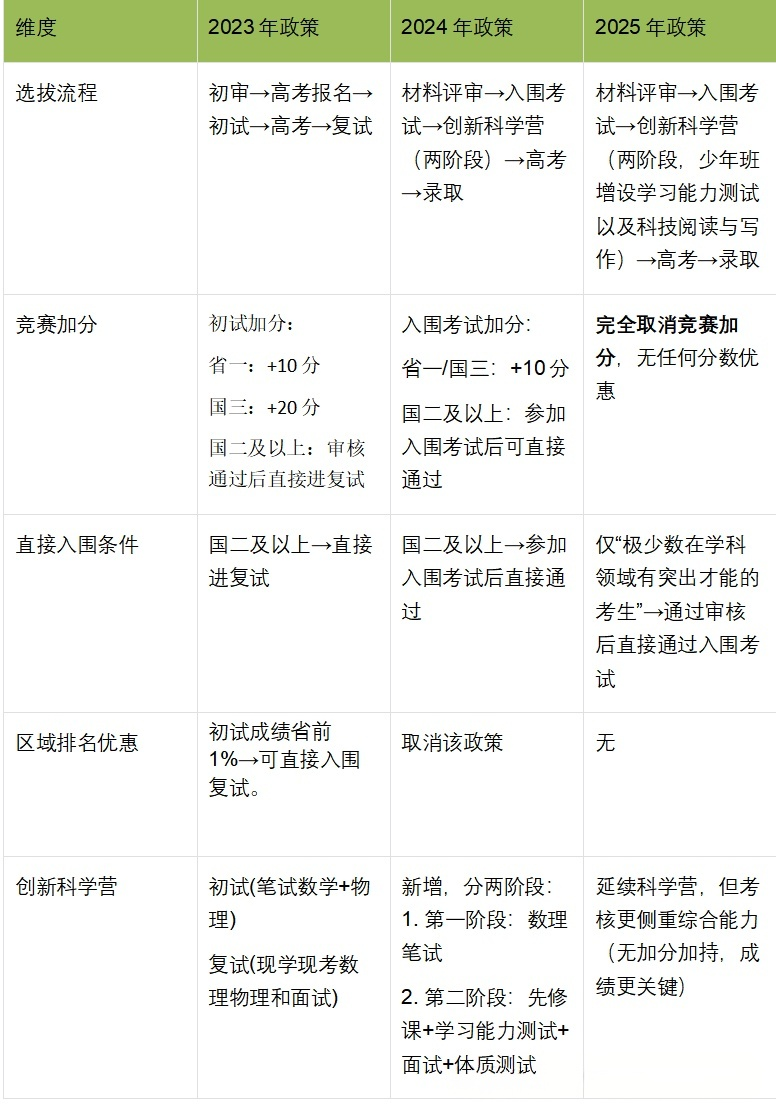 选拔流程核心变化集中在考试环节、竞赛加分、直接入围条件,是三年来调整最频繁的部分: