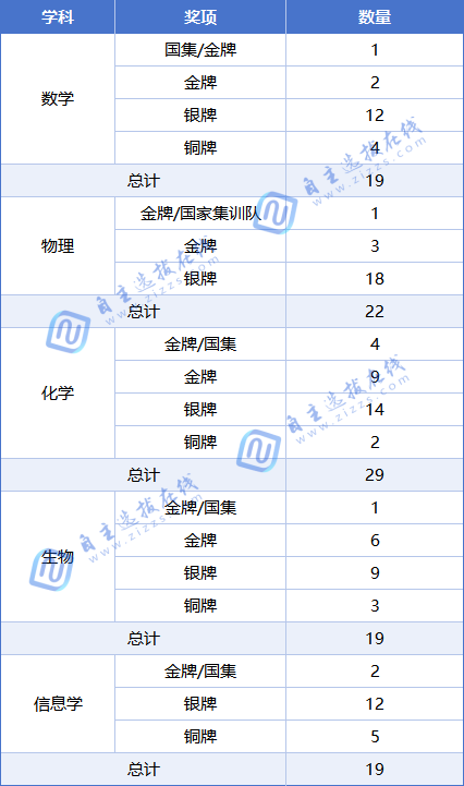 化学是获奖总数最多的学科(29项),其中金牌(9项)和国集(4项)的合计数量(13项) 也遥遥领先。这表明化学学科不仅参与面广,顶尖学生的竞争也异常激烈,整体实力强劲。