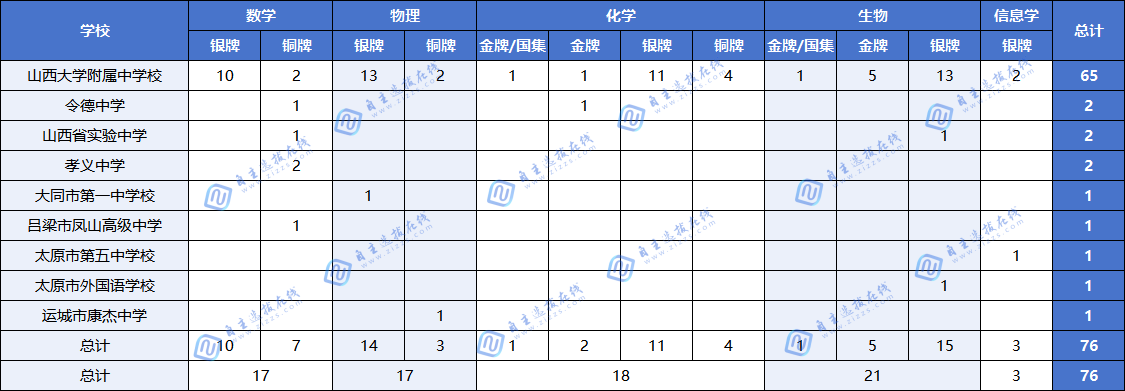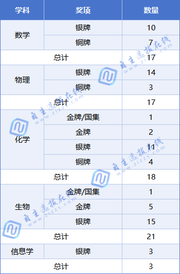 生物:是山大附中表现最突出的学科,共获得21枚奖牌。其中,银牌15枚,金牌5枚,国集1人。