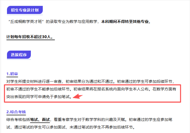 通过清华丘成桐数学英才班初审的同学将进行笔试和面试考核。清华2026丘成桐数学英才班初审环节仅分通过和不通过两档,通过即可参与综合考核笔试,不通过则不再参与后续环节。