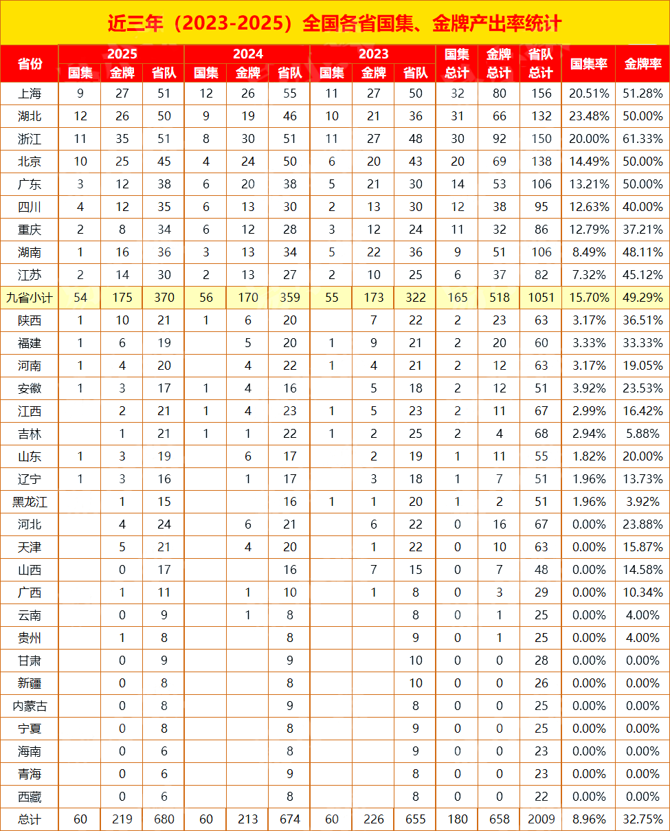 在国集产出率上,湖北以23.48%领先,上海(20.51%)与浙江(20.00%)亦表现突出,成为顶尖选手的稳定输出地。
