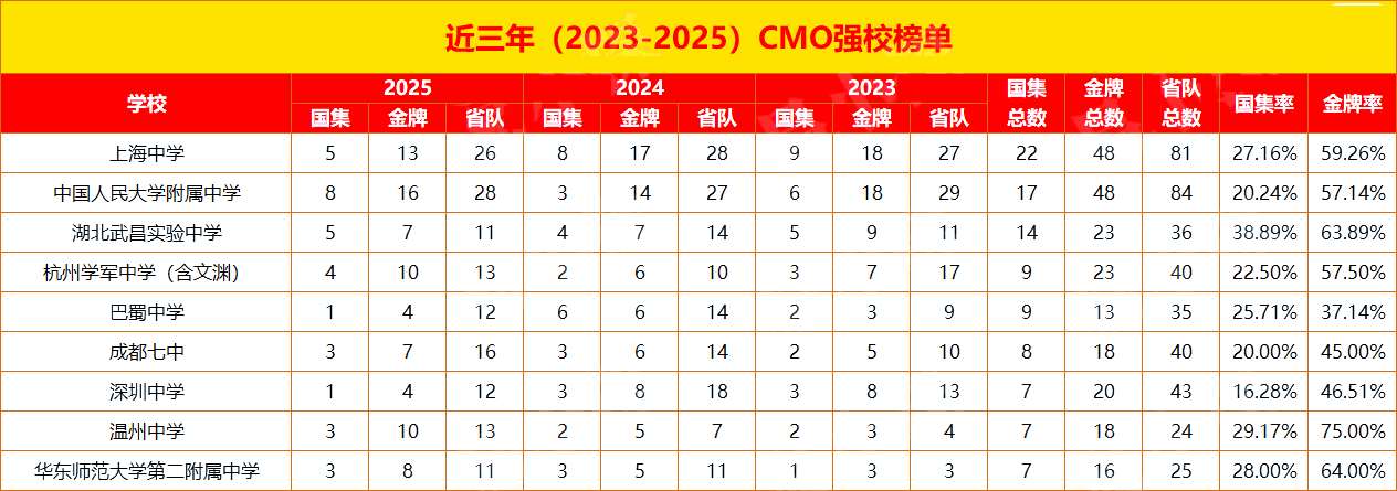 2023-2025年数学决赛(CMO)九省国集、金牌产出率统计一览