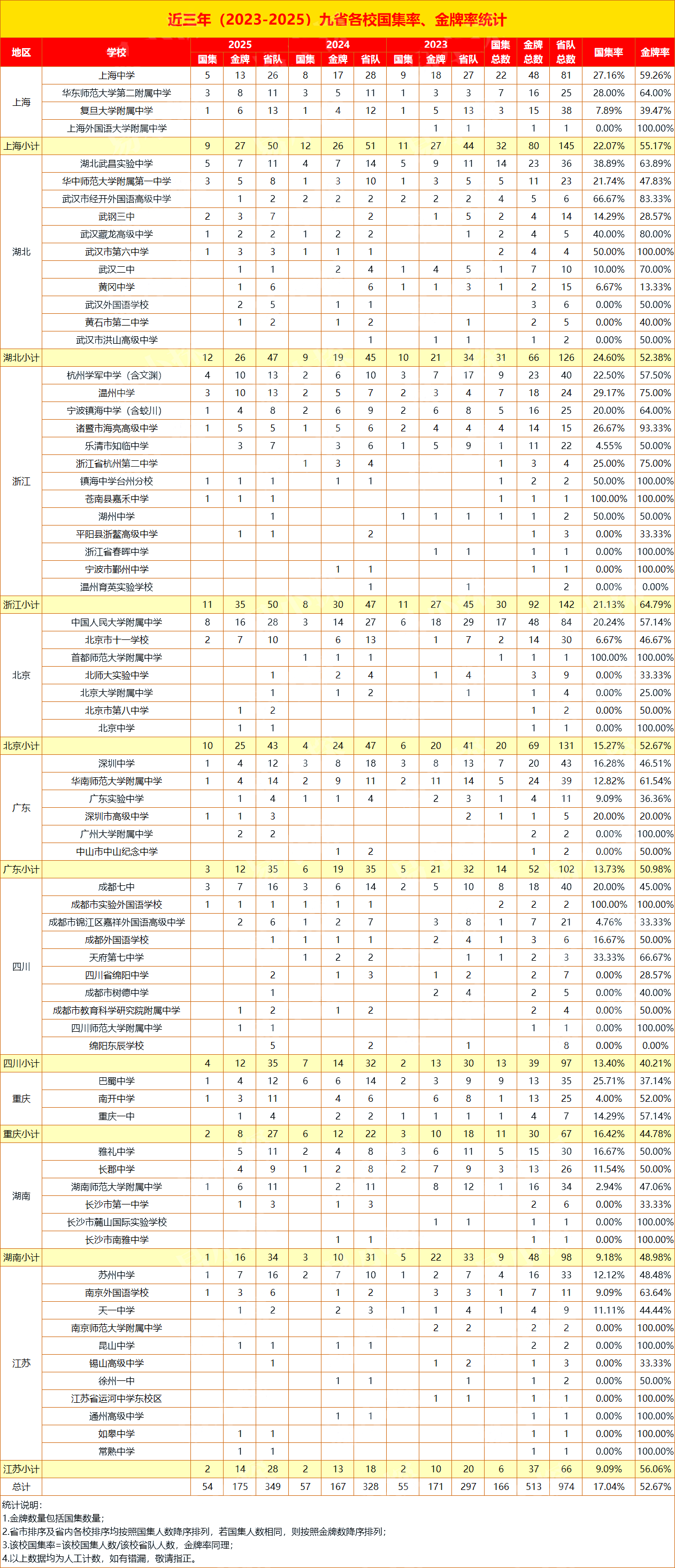 5.从九省各校的金牌产出率来看,温州中学、湖北武昌实验中学、华东师范大学第二附属中学等校金牌率超60%。部分学校的夺金效率更突出,如武汉市第六中学(湖北)、成都市实验外国语学校(四川)等多次实现金牌率 100%,参赛即夺金的表现极具优势。