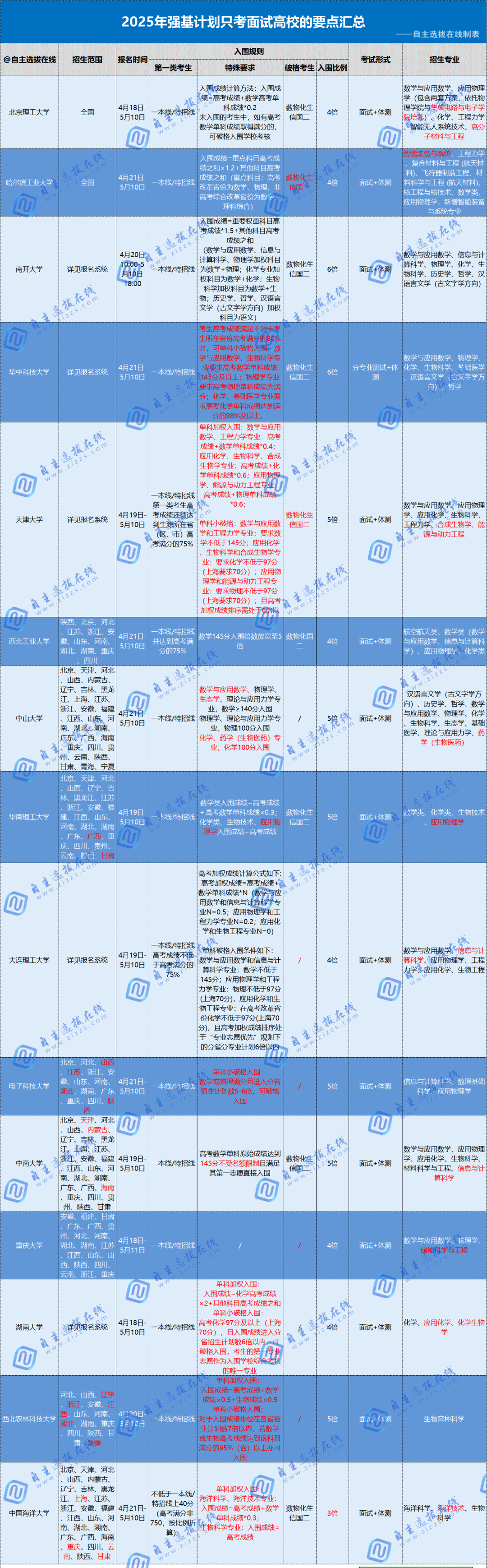 *2025年共有15所强基院校只考面试,分别为:北京理工大学、哈尔滨工业大学、南开大学、华中科技大学、西北工业大学、华南理工大学、电子科技大学、中南大学、重庆大学、天津大学、大连理工大学、中国海洋大学、湖南大学、西北农林科技大学、中山大学。