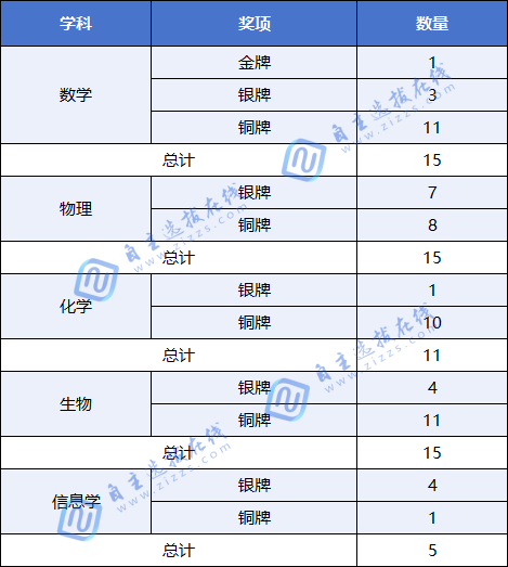 数学、物理、生物三个学科的奖牌总数并列最高,均为15枚,表明在这些领域的竞争参与度或奖项设置规模相对较大、竞争较为激烈。化学学科奖牌总数为11枚。