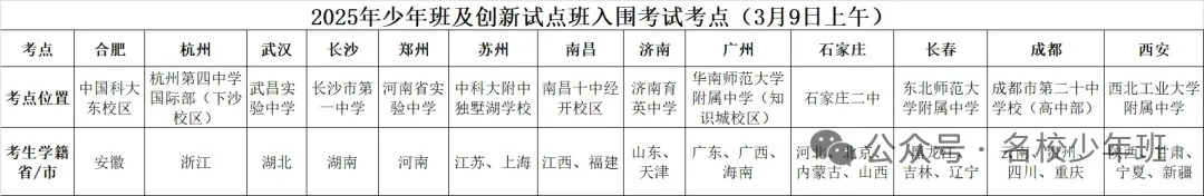 2025年中科大少年班、创新班入围考在上午8:30-12:10开考,入围考试只考数学和物理两个科目,主要考查知识结构、基础概念、逻辑思维。在陕西、浙江、四川、江西、吉林、河北、安徽、湖北、湖南、江苏、山东、广东、吉林等省市均设有考点。